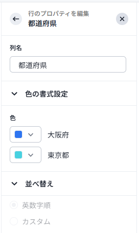 色付きスライスの「行プロパティ」の設定は、列名、色の書式設定、並べ替えとなります。