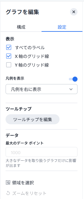 散布図のカスタマイズ項目は、「すべてのラベル」「X軸のグリッド線」「Y軸のグリッド線」「凡例を表示」「ツールチップ」「最大のデータポイント」となります。