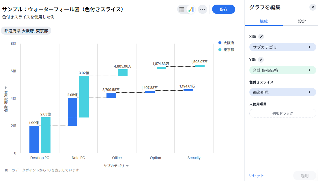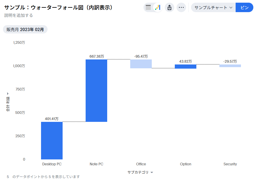 ウォーターフォール図は、開始時と終了時の間でどのように数値が変化したかを可視化するために使われるグラフです。そのため、ある数値に対して属性が必要となります。その他、内訳を把握するためにもよく利用されます。プラスの数値だけではなく、マイナスの数値が入っているような場合にもうまく可視化ができるようなグラフです。