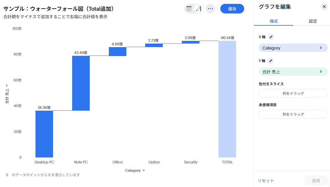 ウォーターフォール図で右端に合計値を入れるような表現が行われるケースがありますが、これを行うには、合計値をマイナスの値のデータとして追加する必要があります。これを行うことで、以下のような表現が可能です。