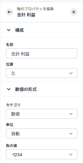 Y軸のプロパティの設定は、「軸の名前」、「位置」、数値の形式(カテゴリ、単位、負の値)となります。