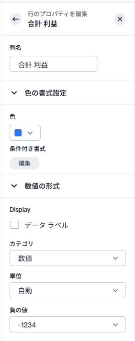 「Y軸の行のプロパティ」の設定は、列名の変更、色の書式設定(条件付き書式)、数値の形式(データラベル、カテゴリ、単位、負の値)となります。