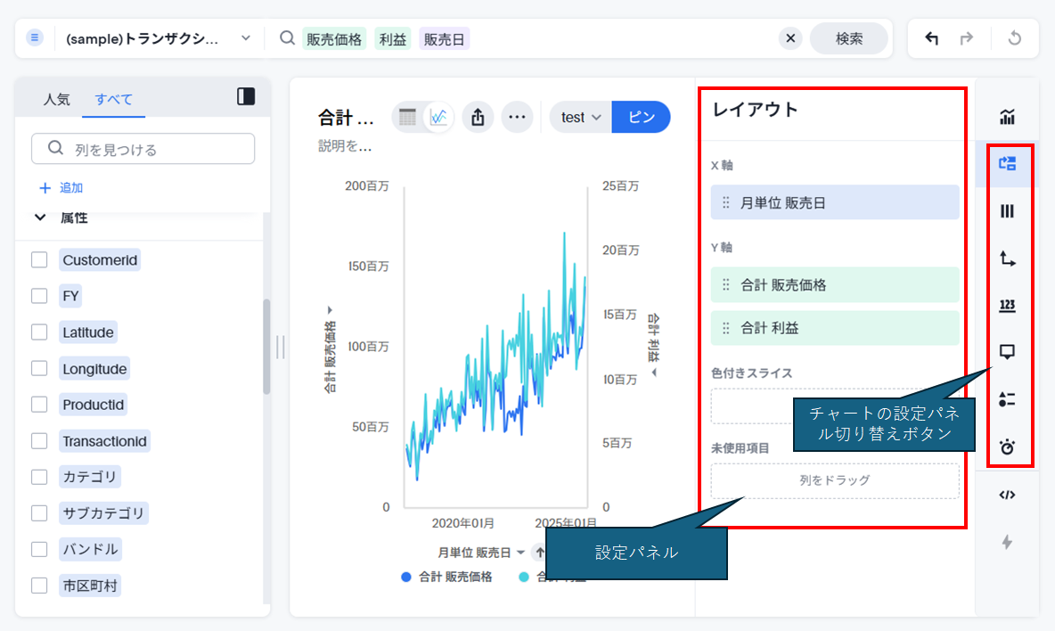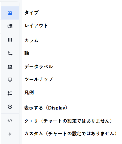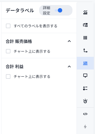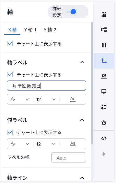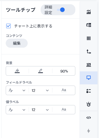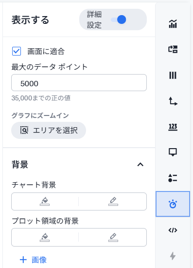 各チャートは詳細を変更することが可能です。右端の各設定パネルの切り替えボタンをクリックすると、設定オプションのパネルが出現します。