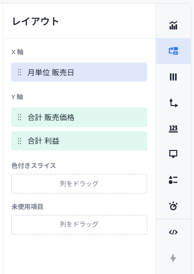 ここで、どの項目をx軸、y軸に設定し、どの項目でスライスするかというのを選択可能です。スライス、色付きスライスは複数項目を設定可能です。