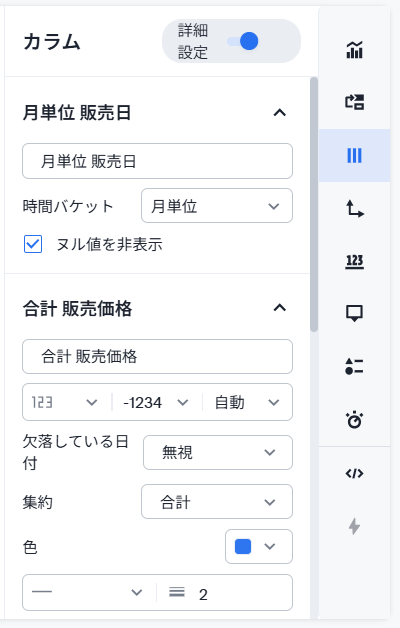 カラムパネルは設定したカラムの各種設定を行うことが可能です。「詳細設定」ボタンがあるので、細かい設定を行いたい場合はそちらのトグルをオンにしてください。