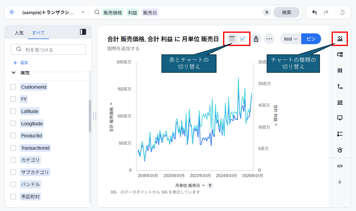 基本的に、チャートの種類は入力したキーワードに応じてThoughtSpotが自動的に選んでくれます。また、チャートの種類によって必要となる属性、数値の数が決まっています。もし、ThoughtSpotが選んだチャートが好みではない場合には、右上の棒グラフの形をしたアイコン「タイプ」ボタンで変更することが可能です。