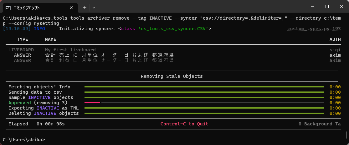 cs_tools tools archiver remove --tag INACTIVE --syncer "csv://directory=.&delimiter=," --directory c:\\temp --config mysetting