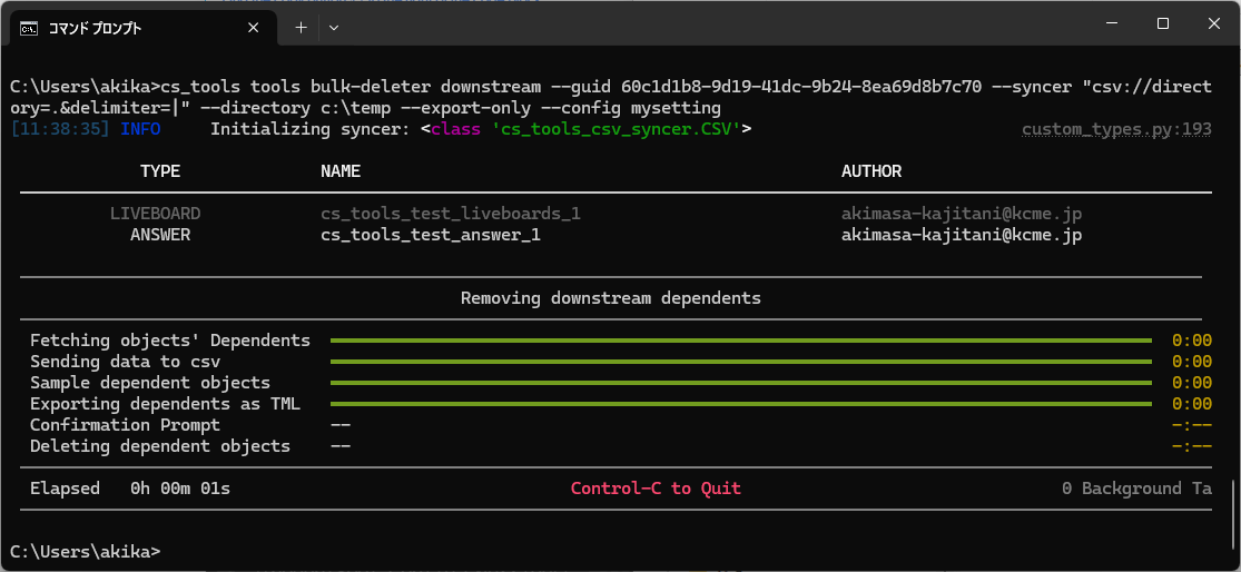 cs_tools tools bulk-deleter downstream --guid 60c1d1b8-9d19-41dc-9b24-8ea69d8b7c70 --syncer "csv://directory=.&delimiter=|" --directory c:\\temp --export-only --config mysetting