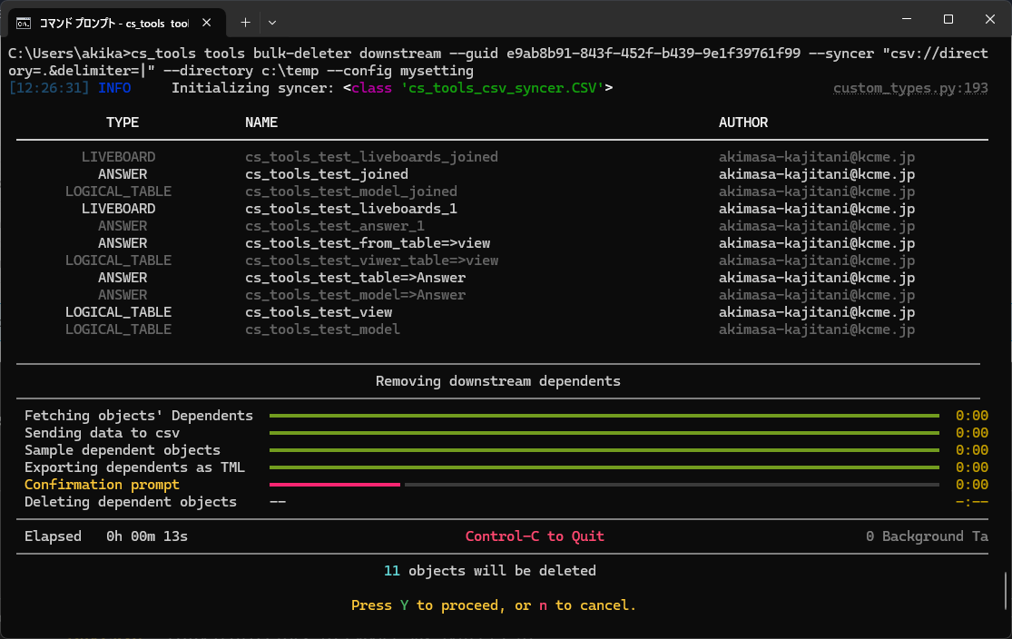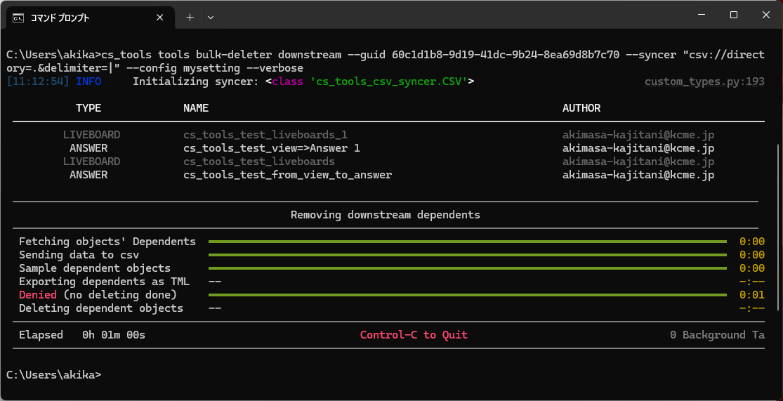 --no-prompt:コマンド実行時に、ThoughtSpot側に影響がある場合、本当に実行するかどうかを聞かれる機能がありますが、このオプションを有効化すると問い合わせなく直ちに実行されます。このオプションを使う際はご注意ください(スケジュール実行するような場合はこのオプションを使うこともあるかと思います)。