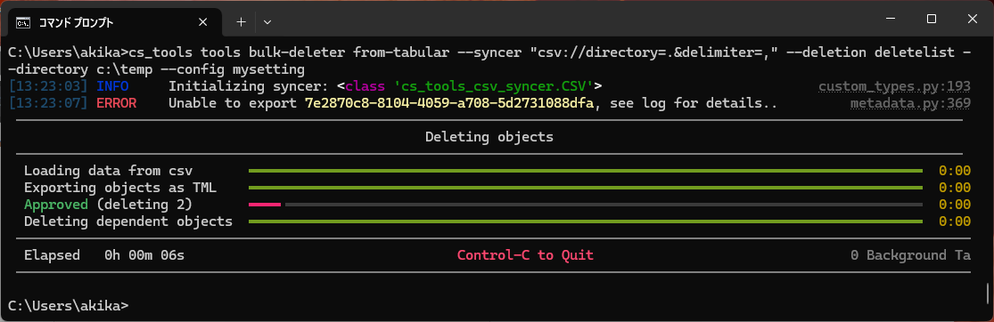 cs_tools tools bulk-deleter from-tabular --syncer "csv://directory=.&delimiter=," --deletion deletelist --directory c:\\temp --config mysetting