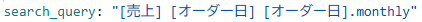 --search-tokens:サーチトークンは、TMLで確認できるものをそのまま利用可能です。例えば、「売上、オーダー日」をTMLで確認すると「"[売上] [オーダー日] [オーダー日].monthly”」となります。これをこのまま使います。