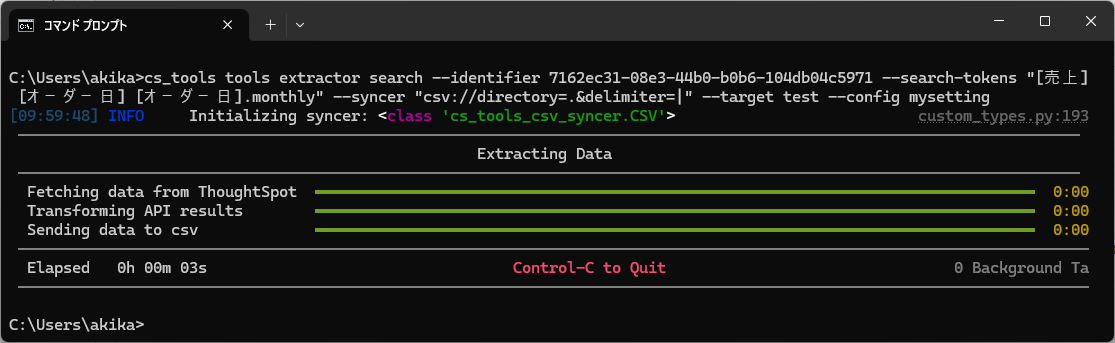 cs_tools tools extractor search --identifier 7162ec31-08e3-44b0-b0b6-104db04c5971 --search-tokens "[売上] [オーダー日] [オーダー日].monthly" --syncer "csv://directory=.&delimiter=|" --target test --config mysetting