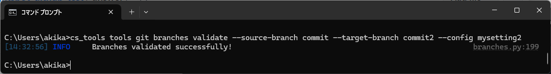 cs_tools tools git branches validate --source-branch commit --target-branch commit2 --config mysetting2