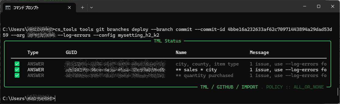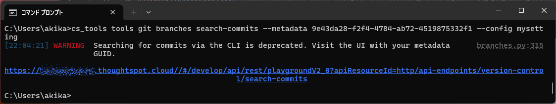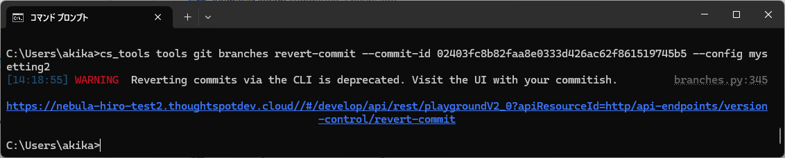 以下のコマンドは、commitというブランチの、コミットIDが「d260075d38247cc1db1f9765c23d37d8de63d080」のものをThoughtSpot側に書き戻すコマンドです。