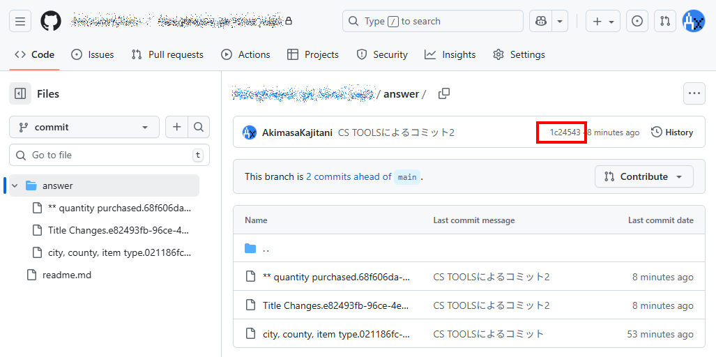 commit IDは、GitHubにて確認しますが、書き戻したいオブジェクトがあるブランチを選択し、下記スクショの赤色の部分がcommit IDの頭数桁分となります。