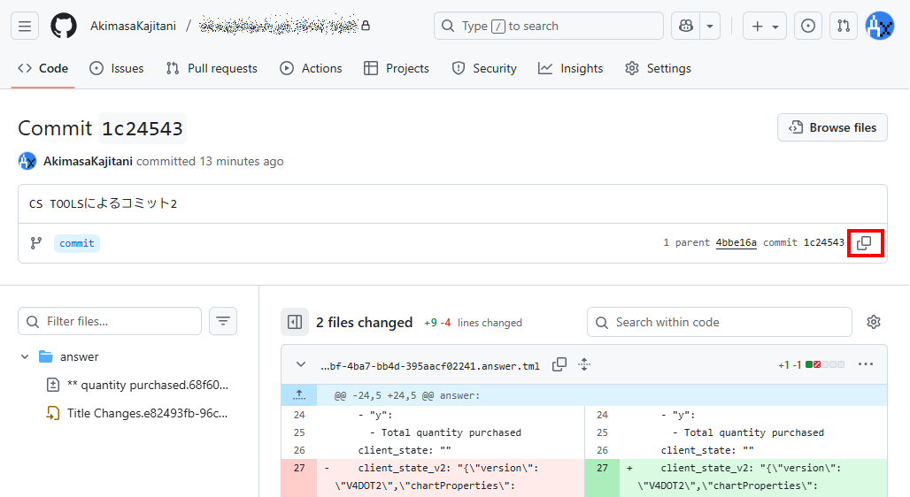 これをクリックすると、何が変化したか、というのを確認する画面になりますが、ここでコピーボタンをクリックすると、commit IDが取得できます。