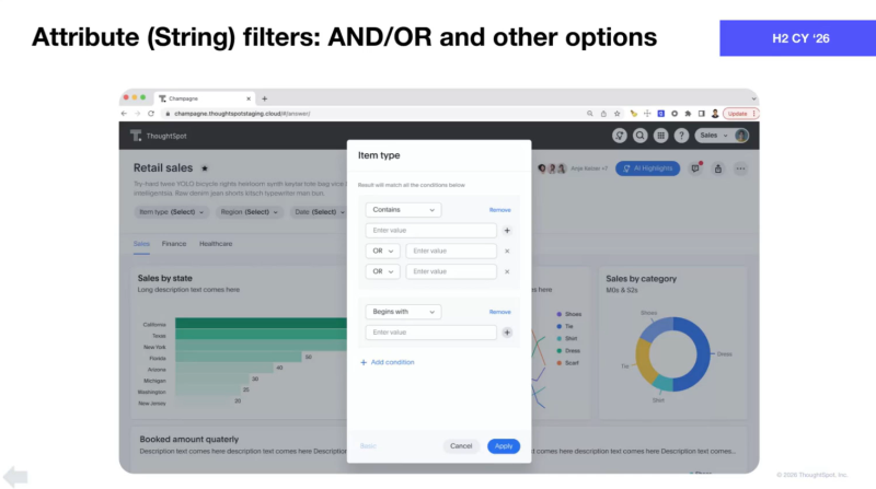 - 文字列フィルター: AND/OR 条件や「で始まる」、「で終わる」などを使用したフィルター処理 (H2 CY 26)