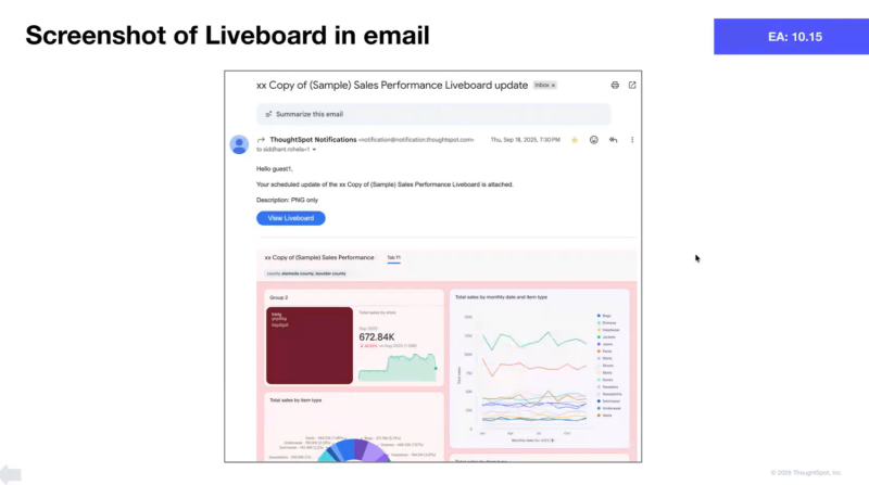 - Liveboard、タブ、グループ、または視覚化を対象とする明確で動的なサマリーを生成し、ユーザーが重要な情報をすばやく把握できるようにします。