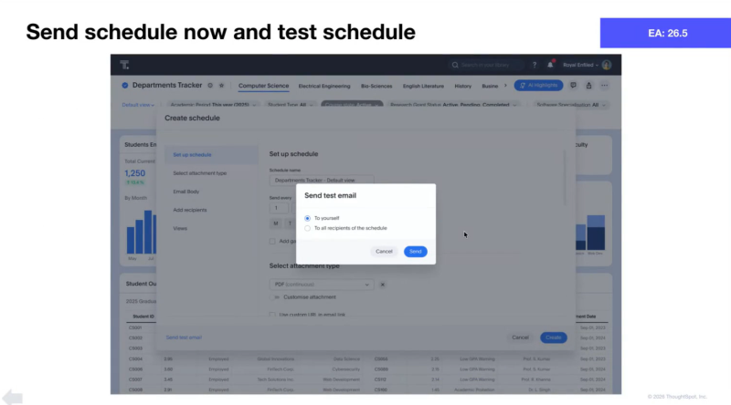 - きめ細かな権限設定が可能な、PDF、CSV、PNG、Slack、カスタマイズ可能な電子メール エクスペリエンスを通じて、信頼性の高いスケジュールされた出力を提供します。