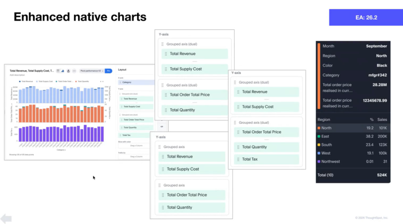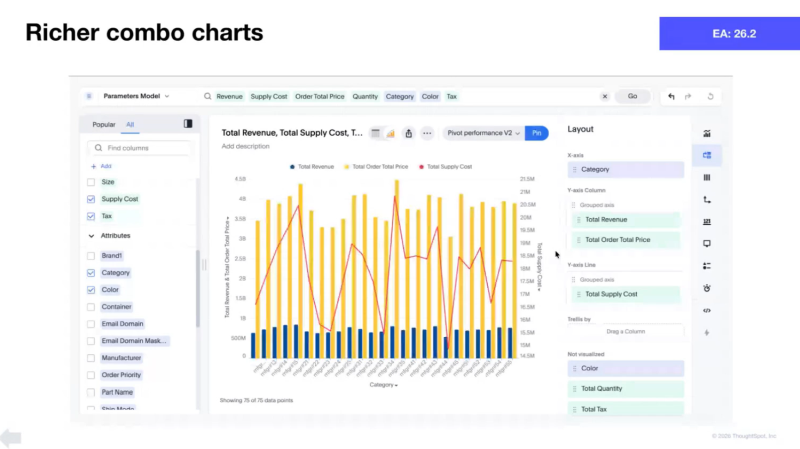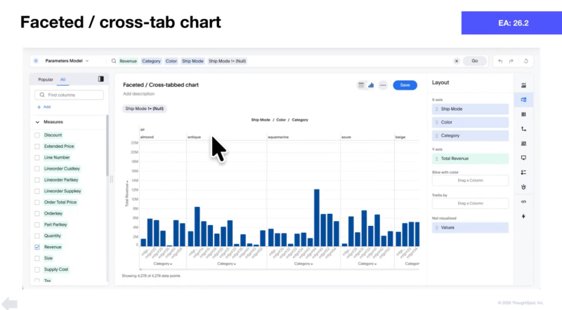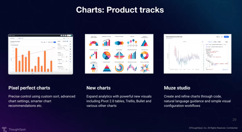 - ThoughtSpot でネイティブにサポートされていないビジュアルを含むあらゆるチャートを即座に生成し、ユーザーに強力でまったく新しい分析の可能性を提供します