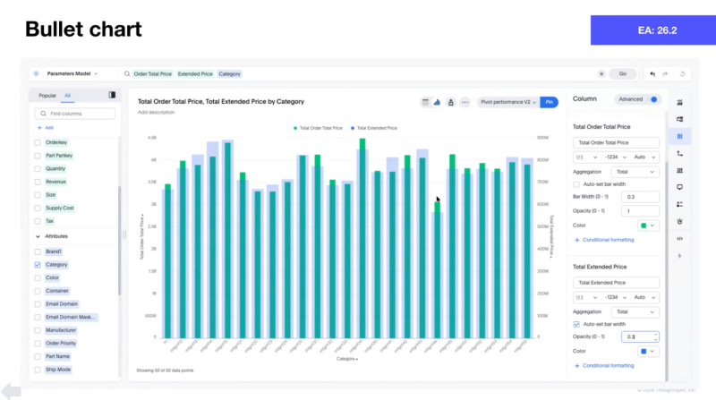 - ピボット 2.0 テーブル、トレリス、ブレット、その他のさまざまなチャートを含む強力な新しいビジュアルで分析を拡張します。