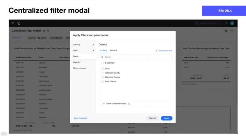 - 直感的で集中管理された、権限を考慮したコントロールを使用して、高度な日付および文字列フィルターでデータを探索します。