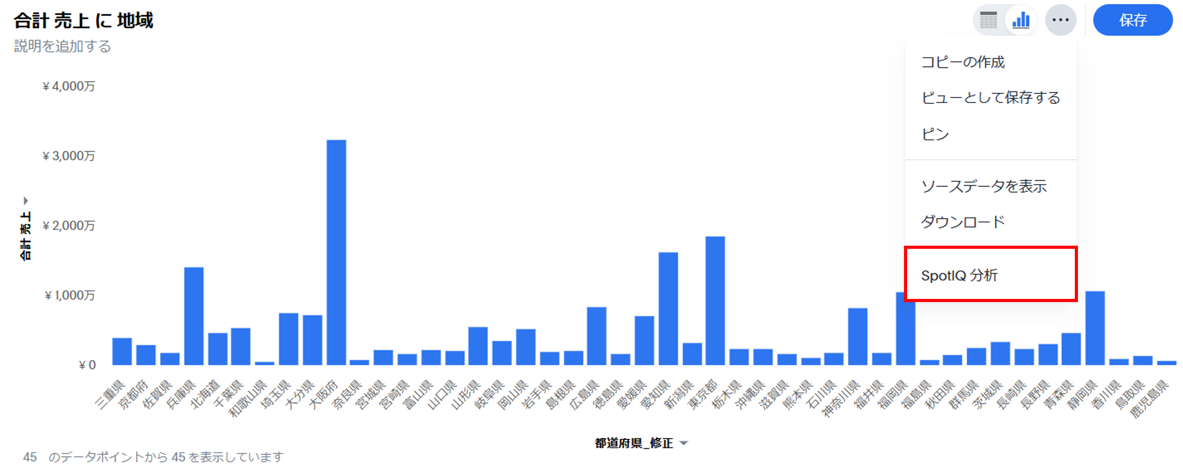 都道府県ごとの売上合計のグラフからSpotIQ分析を行っていきます。