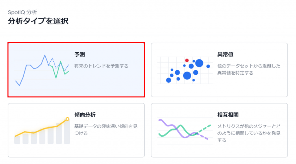 予測分析はKPIチャートでのみ実行可能ですが、以降で紹介する分析では、予測分析のようにグラフ種類の指定はありません。