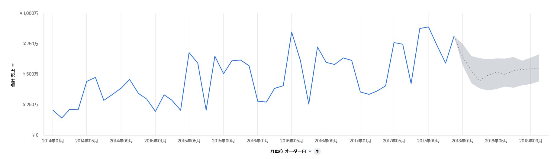 「予想データポイント」では、どのぐらい先まで予測するかを設定します。デフォルトでは10に設定されており、データポイントから10単位先まで予測します。今回は月単位グラフのため、10か月後まで予測することになります。