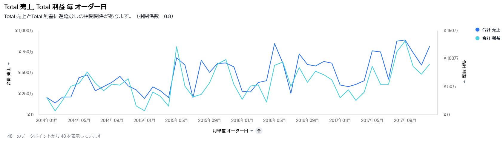 売上と利益の折れ線グラフが表示されました。インサイトに加えて、相関係数も表示されます。