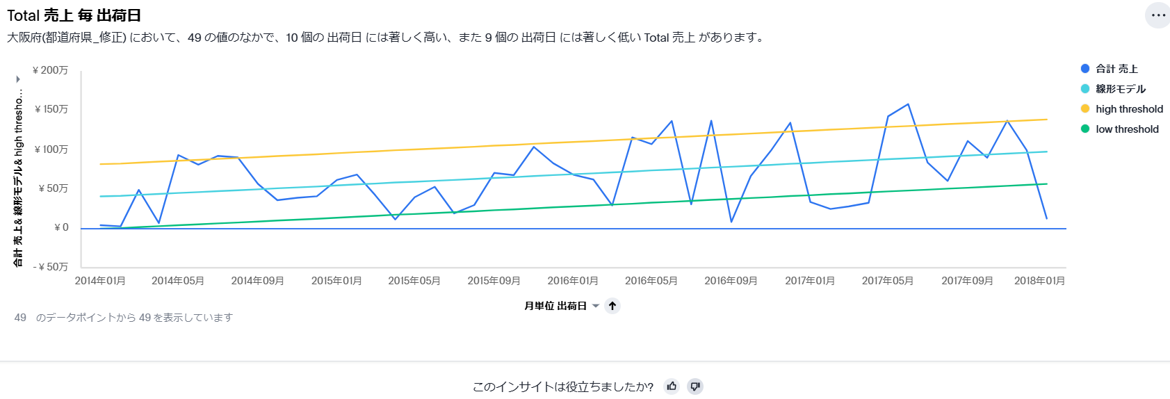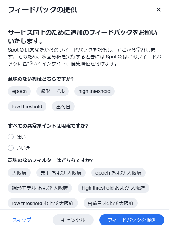 また、グラフの一番下に「このインサイトは役立ちましたか?」という表示があります。これは予測分析と変更分析以外のSpotIQに表示されるもので、ユーザーからSpotIQにフィートバックを与えることができます。フィードバック画面は以下になり、この情報からSpotIQが学習を行い、次回からより最適な分析が行われます。