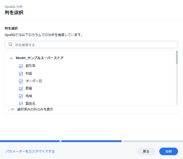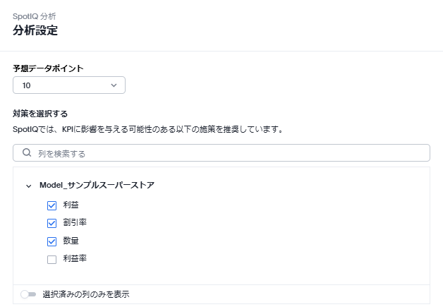 「対策を選択する」では、分析に使用するメジャーが表示され、自由に選択できます。SpotIQが自動で選択してくれるため、今回はデフォルトのままで行います。
