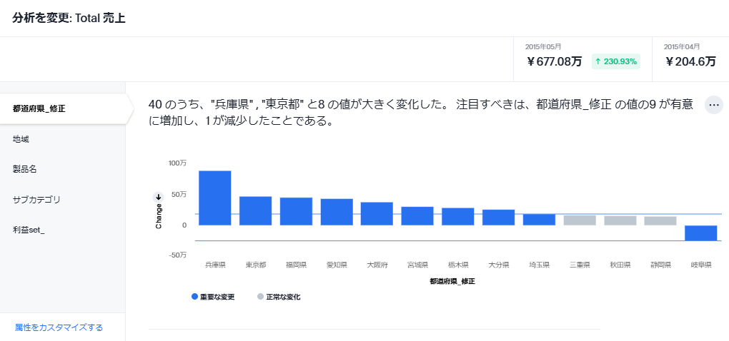 選択したデータポイント間での変化を属性ごとに調べることができます。最も関連性の高い上位5つの属性がデフォルトで選択されますが、左下の「属性をカスタマイズする」より、自由に選択することができます。