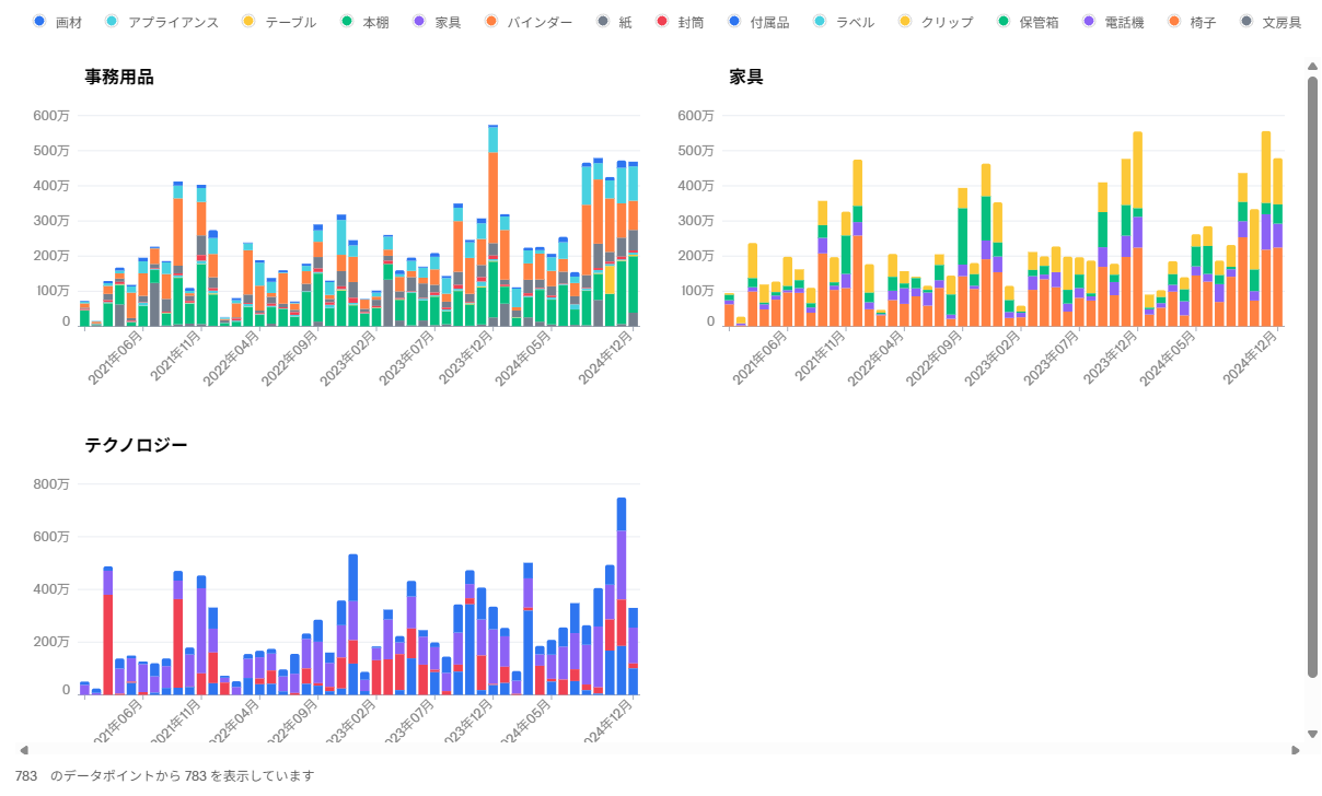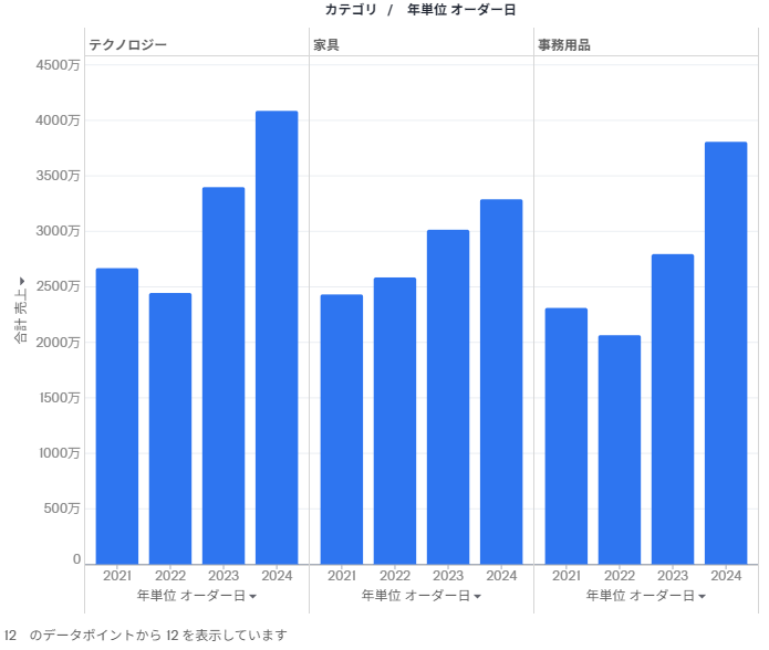 この時、レイアウトとして、X軸ではカテゴリごとに年単位のグラフを描くように設定を行っています。