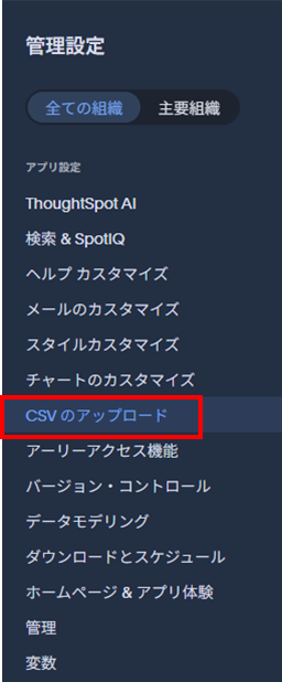 まず、最初に管理者メニューで機能をオンにする必要があります。管理者メニューの「全ての組織」の「アプリ設定」から「CSVのアップロード」を選択してください。