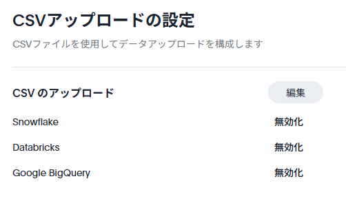 CSVアップロード可能なのは、Snowflake、Databricks、BigQueryの三種類なので、この中から利用したい種類をオンにします。