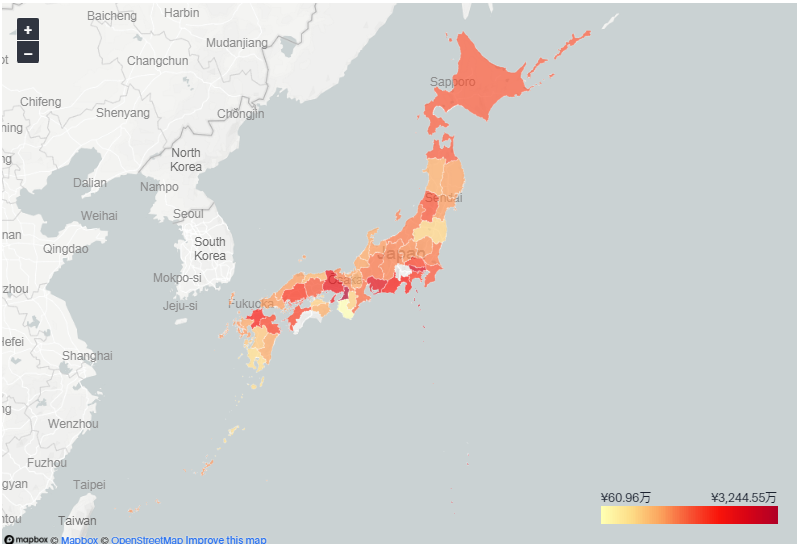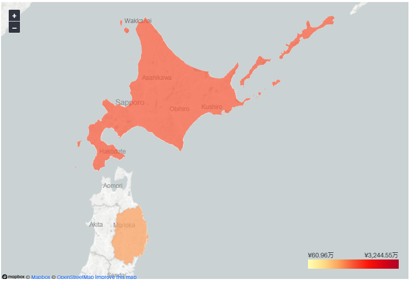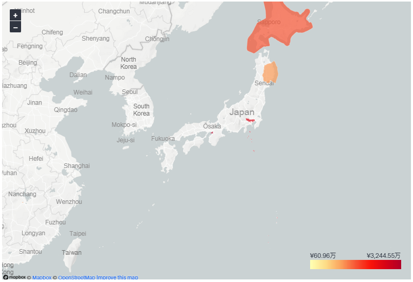 最後は地域ヒートマップです。これも地域バブルチャート同様、都道府県の県庁所在地の緯度経度データを別のテーブルで準備し、結合しています。