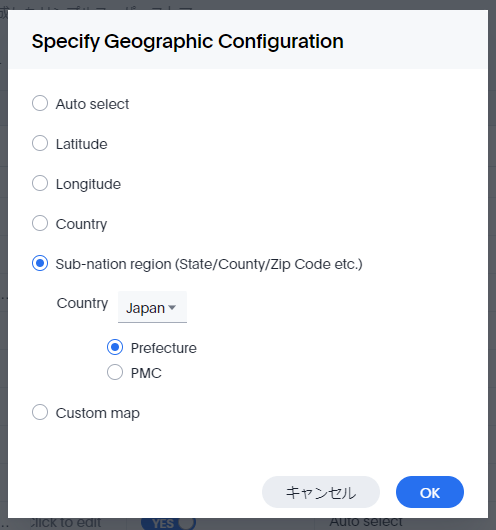 ここで、都道府県の場合は、「Sub-nation region(State/County/Zip Code etc..)」を選択し、Countryは「Japan」にし「Prefecture」を選択すればオッケーです。市区町村であれば、「PMC」を選択してください。ドキュメント「Geo map reference 」に記載の通りのCSV に記載しているとおりの文言である必要があります。市区町村の場合は、例えば東京都港区の場合は、「東京都港区」と記載する必要があります。詳細はCSVをダウンロードして確認してみてください。