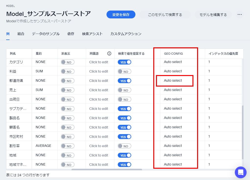 GEO CONFIGの設定は、旧UIだと「データ」タブ、新UIだと「データワークスペース」から設定が可能です。各ワークシートやモデルをクリックすると、詳細設定画面が出ます。この中の右の方に「GEO CONFIG」という項目があり、初期設定は「Auto select」になっていますが、これをクリックすることで変更することが可能です。