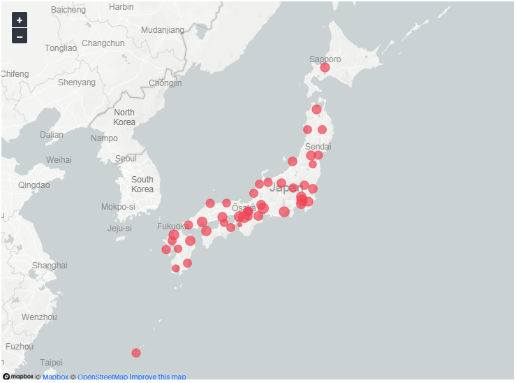 次は地域バブルチャートです。都道府県の県庁所在地の緯度経度データを別のテーブルで準備し、結合しています。